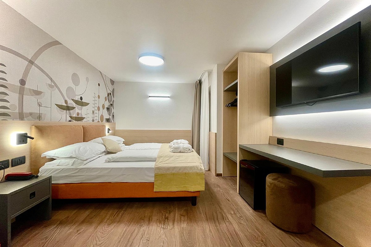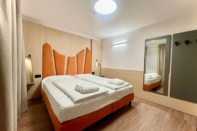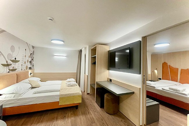 Familienräumlichkeiten mit Terrasse oder Balkonen, bestehend aus zwei oder drei miteinander verbundenen Zimmern, mit modernen Möbeln in Holzoptik, einem Badezimmer, zwei LCD-Fernsehern, WLAN, Telefon, Tresor und Kühlschrank. Die Familienzimmer der Dependance können zwischen 4 und maximal 6 Personen aufnehmen!
